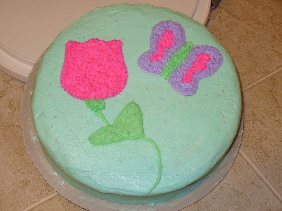 This is a single layer yellow cake with bc icing. I used cookie cutters for my pattern but really need to work on them stems & leaves. Not bad for #1!