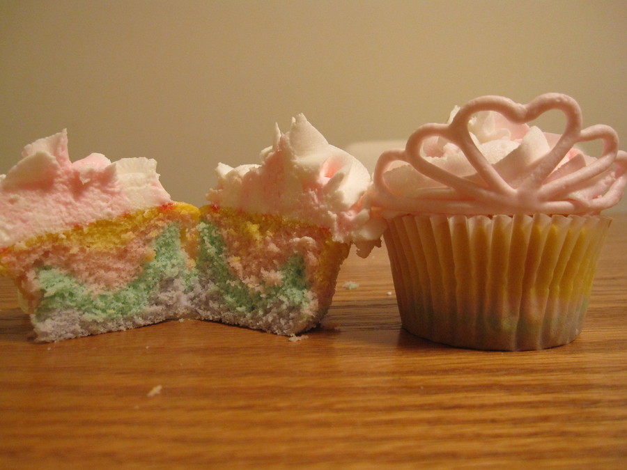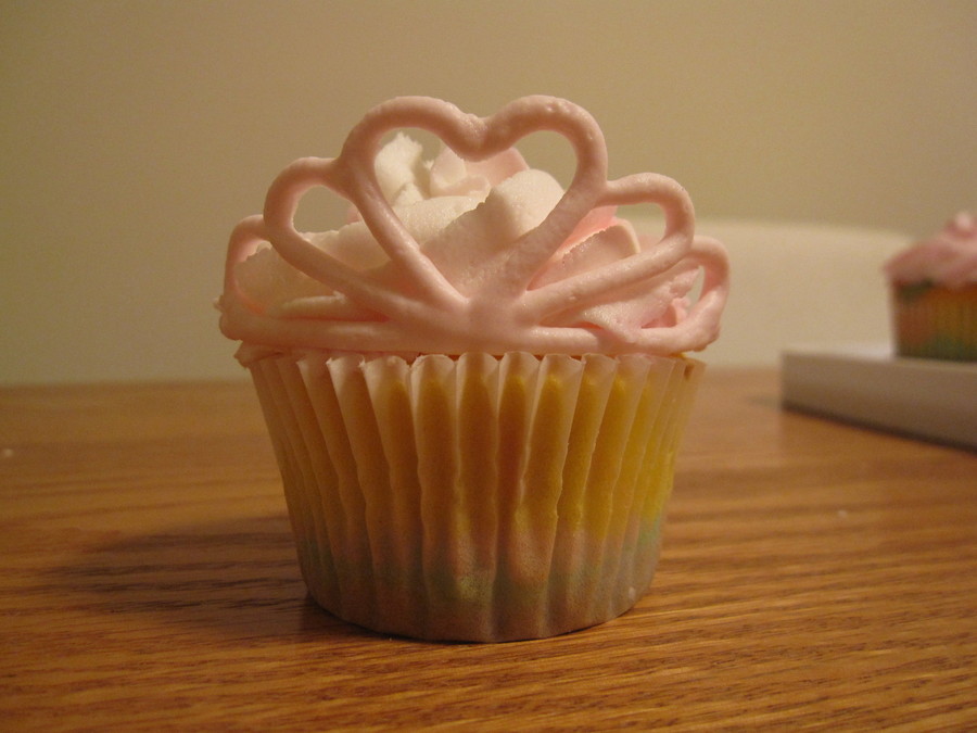 Made for a five year old girls princess birthday party. Crowns are made from royal icing and molded on large flower formers. Icing is swirled white and pink buttercream.