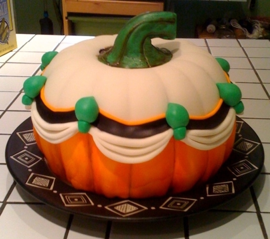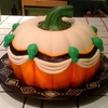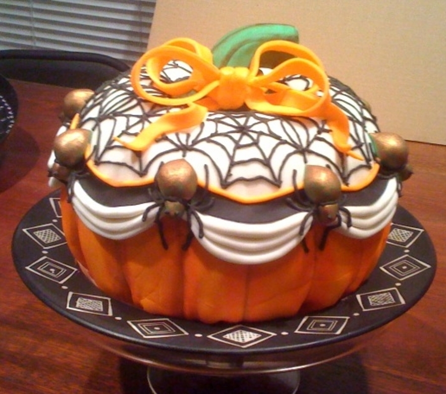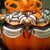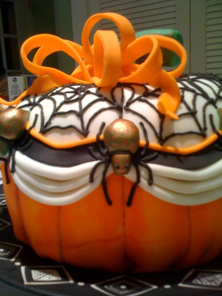 My significant other's b-day is Oct. 30 and mine is Nov. 6, so we had a Halloween/birthday party. This is the Happy Boo-day Cake I made for us. It was my first time making and working with fondant, and wow, did I make a lot of mistakes (but learned even more). First of all, I used the wrong kind of cake for this type of cake design. I used two Bundt cakes to make the shape. The bottom cake was made of devil's food, which fell apart into big chunks instantly when burdened with the weight of the marble cake on top. I was forced to "glue" it back together with liberal amounts of buttercream, then reinforce it with plastic drinking straws. I then placed the top Bundt cake on a cardboard platform on top of the drinking straws, tiered-cake-style. Secondly, never having used fondant before, I made it too hard and dry (I didn't know what the proper consistency should have been). I now know also that fondant will not dry stiff enough to make a bow. I also did not plan enough drying time for the loops in the bow either, so the bow turned out a mess. I also tried two different fondant recipes and found that MMF was much easier to make than the other more traditional fondant recipe. I think I'll be making this cake again with some changes next halloween. I think it'll be cleaner without a bow (even a well made bow), and instead of piping the spiderweb, I would paint it on. I've included a picture of the cake before the bow and spiderwebs were added, and I think it looked cleaner then. The good news was that the cake actually tasted really good and it was completely gobbled up that night. Of course, this being my first attempt at a fondant covered cake, I immediately wanted to try to make another one...which I did! I made myself another birthday cake (happy birthday to me! LOL) using pound cake the following week and had friends over for another birthday party! I will post pictures of the second cake separately...