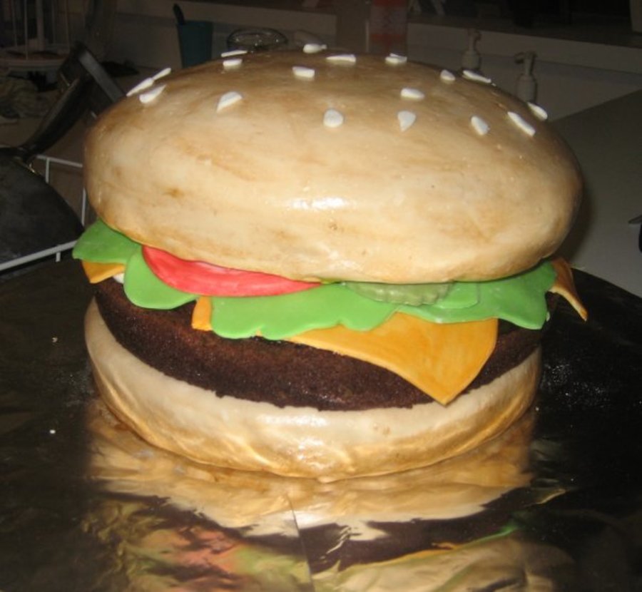 My second cheeseburger cake. White cake for bread , chocolate cake for meat.