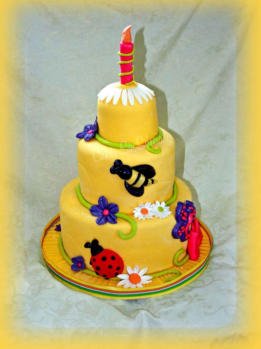 Chocolate cakes with Bees, Butterfly, LadyBug and flowers. Fondant Candle on top!!!
