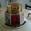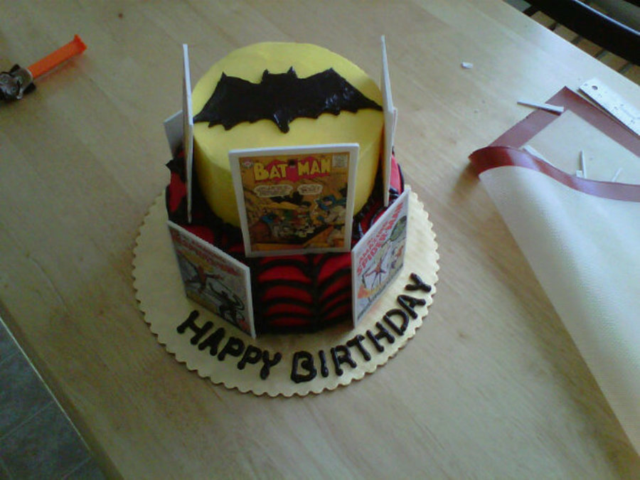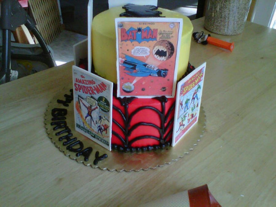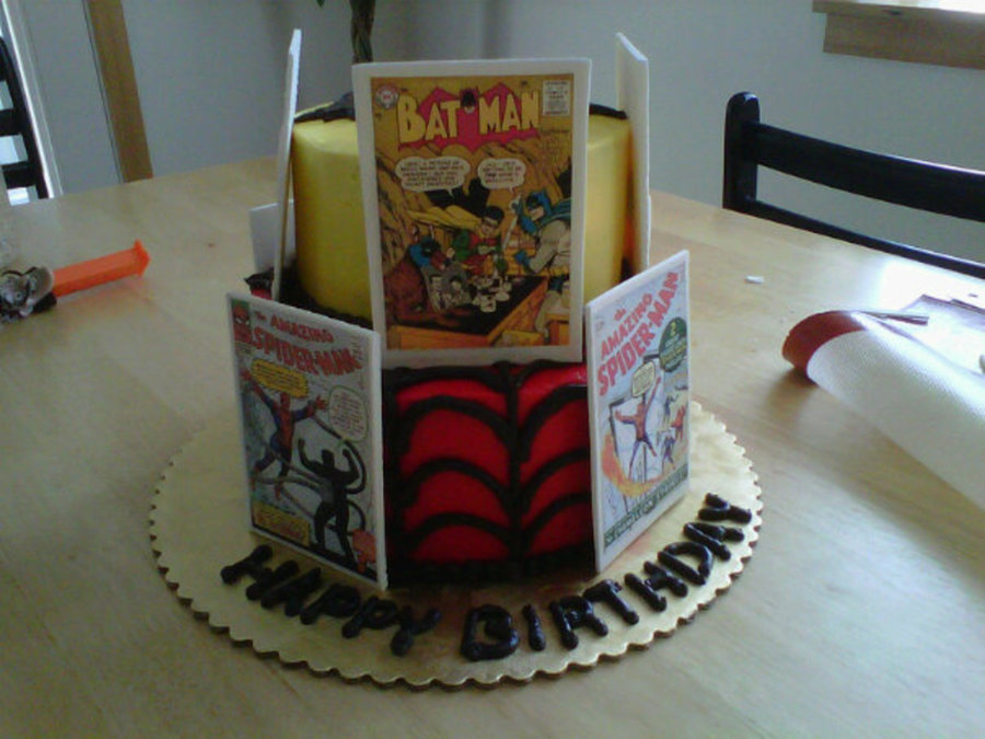 a tiered batman and spiderman birthday cake. The cake was chocolate with whipped cream and strawberries filling. The cake is covered in buttercream with gumpaste panels.