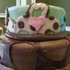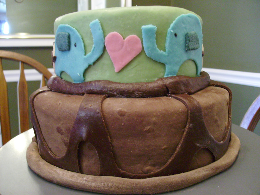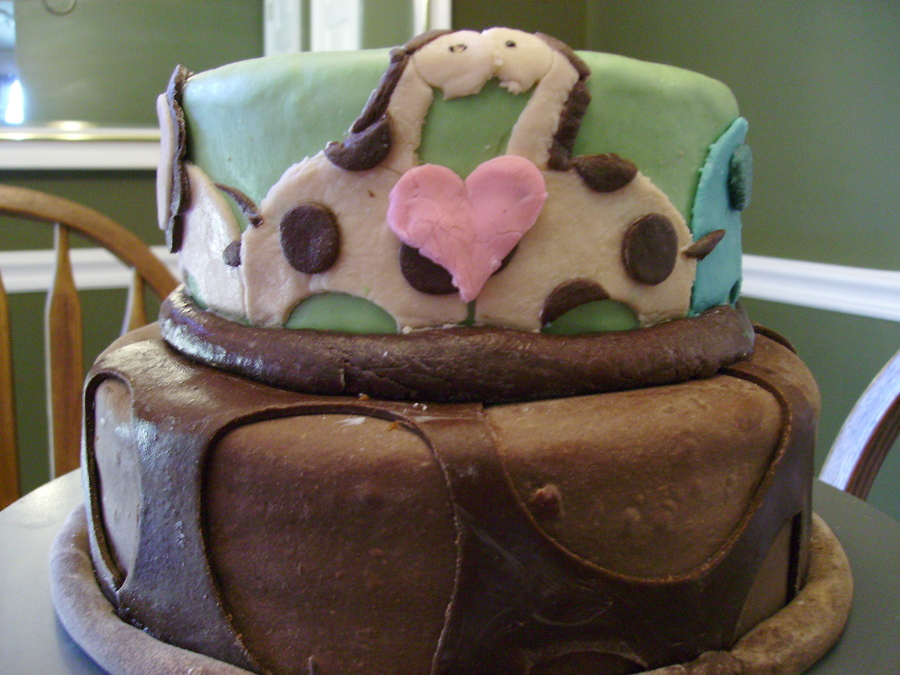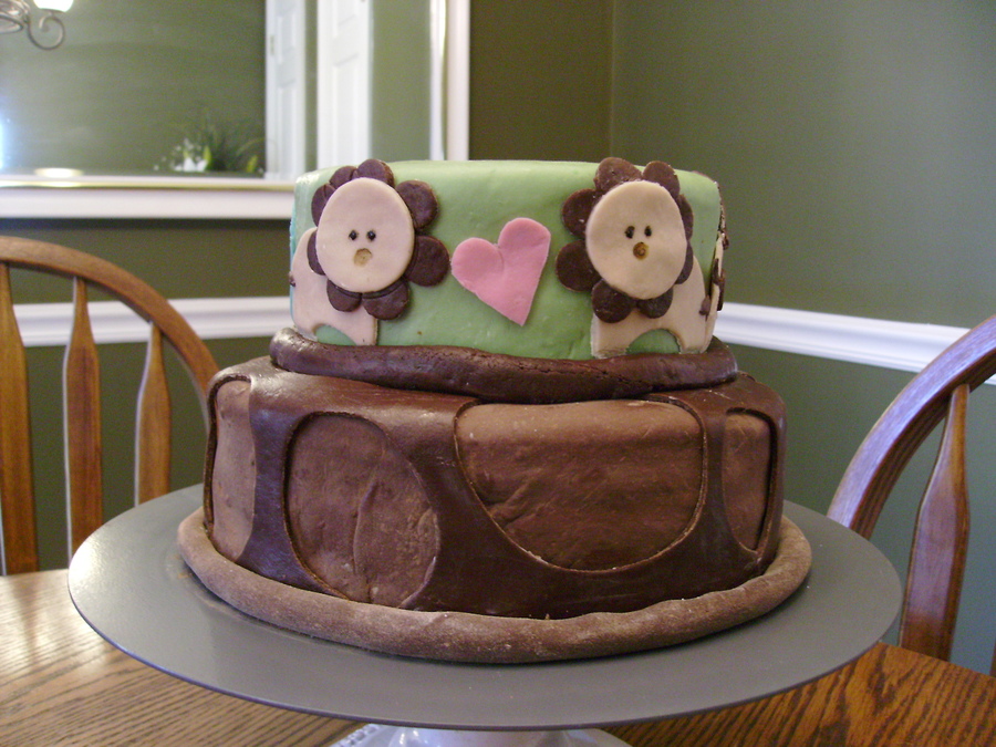 For my own baby shower - matches the invitation that my sister in law used. Bottom layer is Chocolate Top Layer is plain Yellow. Iced with Buttercream then covered with my own recipe of Chocolate Fondant.