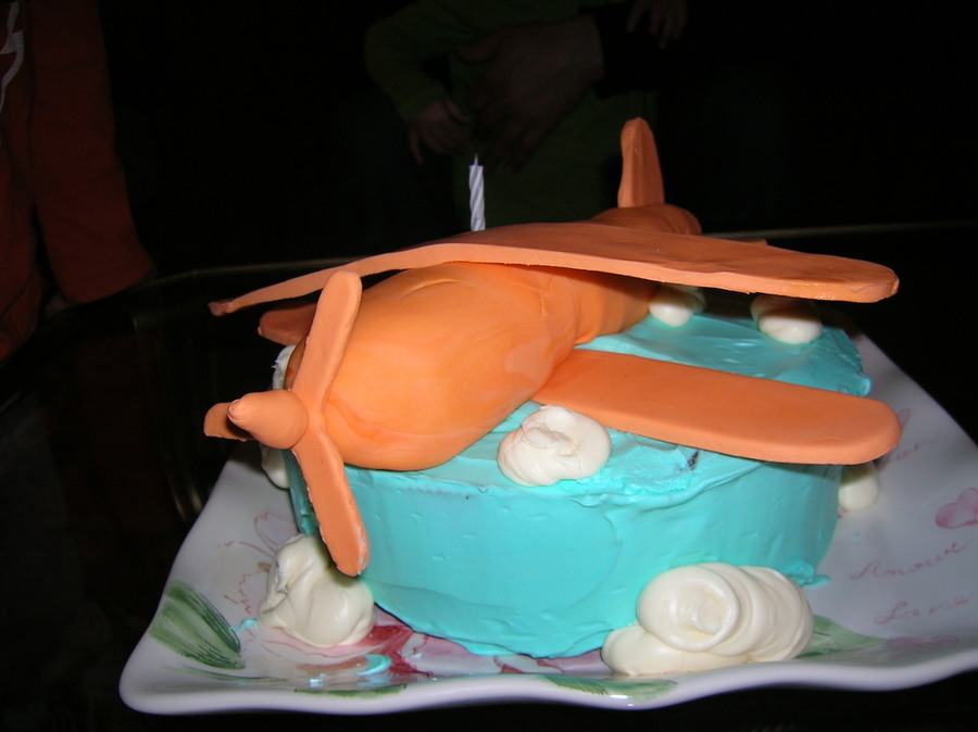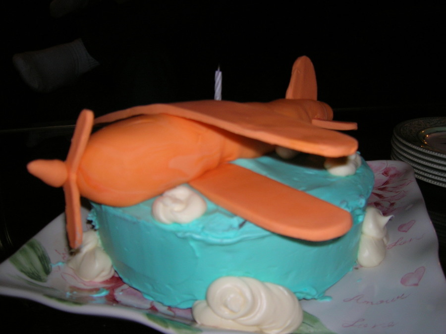 Airplane cake I made for my hubby. Iced in buttercream, with buttercream clouds and the airplane is MMF and gumpaste. Took a while to make the plane but my kids demolished it in less than a minute!