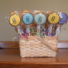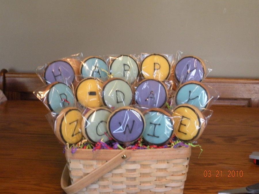 This was my first attempt at a cookie bouquet. I made this for my daughter's class treat for her birthday. Really wish that I would have bought a long enough basket to spell out birthday but o-well. Not to shabby I guess. I used NFSC, marshmallow rolled buttercream, and royal icing. Eh.
