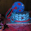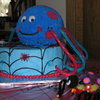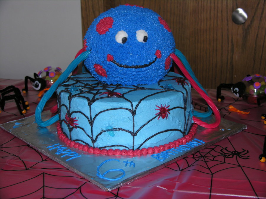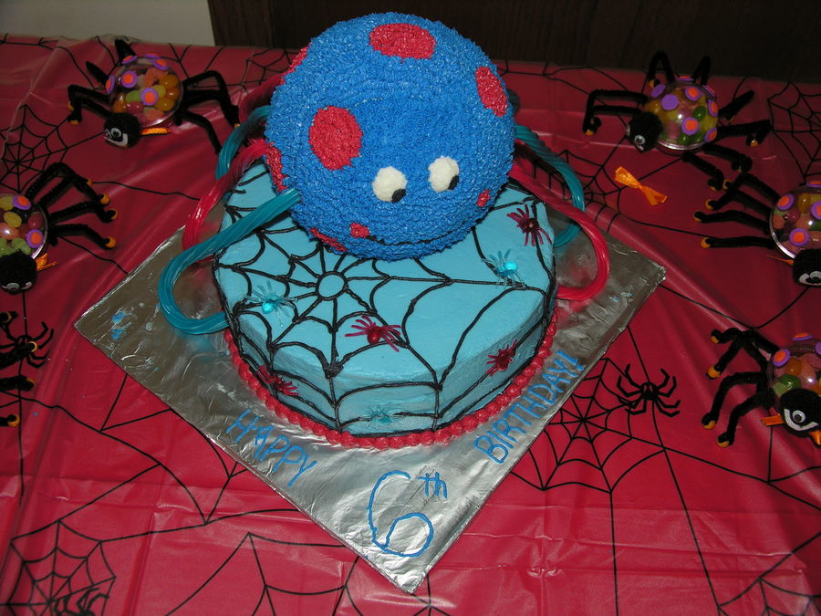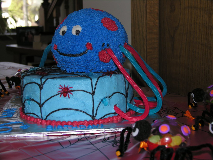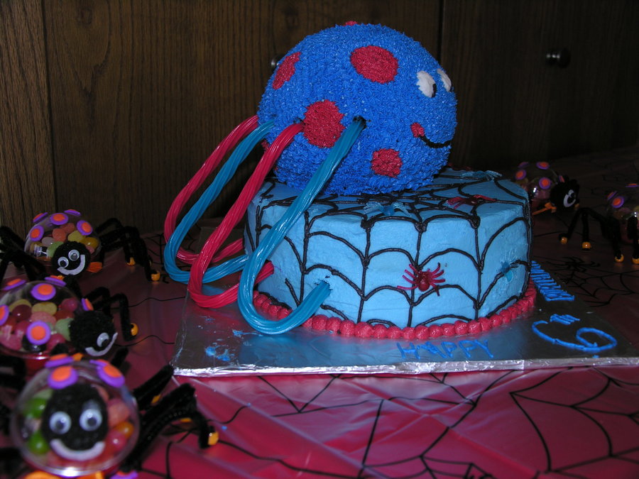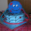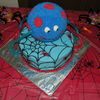 Per the request of the birthday boy ..... a blue spider with red dots. The red and blue mini spiders were also his idea (not edible). 9" round 2 layer chocolate fudge cake on bottom with Oreo pudding filling. Ball cake is chocolate fudge. All decorated in butter-vanilla flavored buttercream frosting. Legs are rainbow twizzlers.