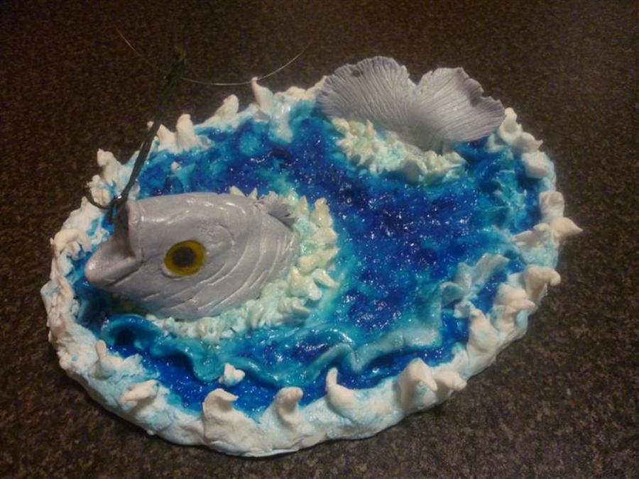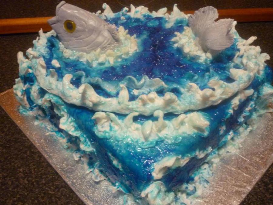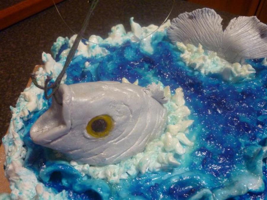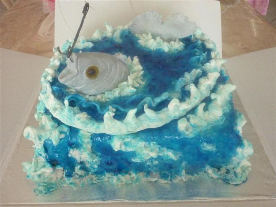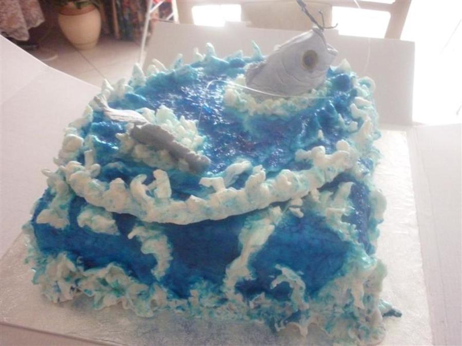 Made this for my father-in-law's 70th birthday, last week. He absolutely loves fishing, so going with a fish style cake was a no brainer! This was my first attempt at sculpting something out of fondant with no template, and I loved it. I found it very relaxing. The waves on the other hand were very tricky and took me much longer than the fish - not quite as relaxing! The water effect and the fish eyes were from piping gel, the hook is made from wire, lightly covered in fondant for effect, and the inspiration for the cake was from many of you guys here on CC, so thank you all so very much. I did the fish as a topper, so dad could have something to keep as a memento, which he was pretty thrilled about!