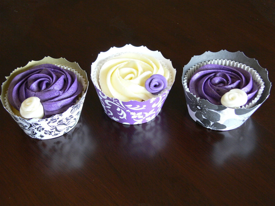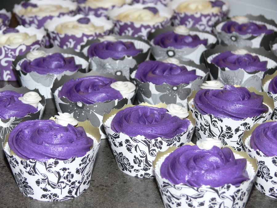 Wedding shower cupcakes for my good friend Lauren. Three flavours for these ones: vanilla chocolate chip, orange, and white chocolate raspberry. The purple buttercream icing was piped with a Wilton 1M tip to get the rose look, and each cupcakes was topped with the fondant roses. I made the roses according to Chef Duff's method, and they were super easy!! This was also the first time that I made the cupcake wrappers too. A little time consuming, but were totally worth it as they looked great, and was a great way to tell the flavours apart.