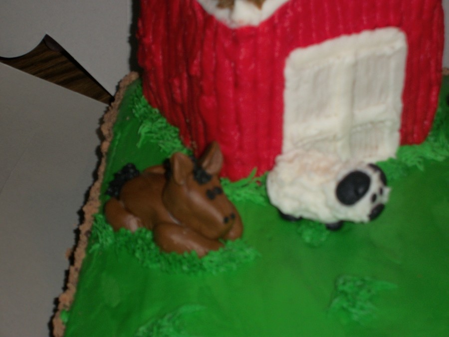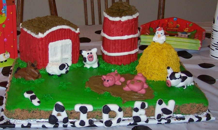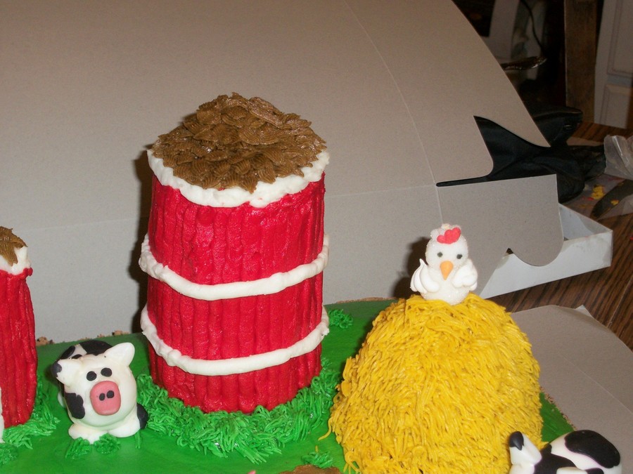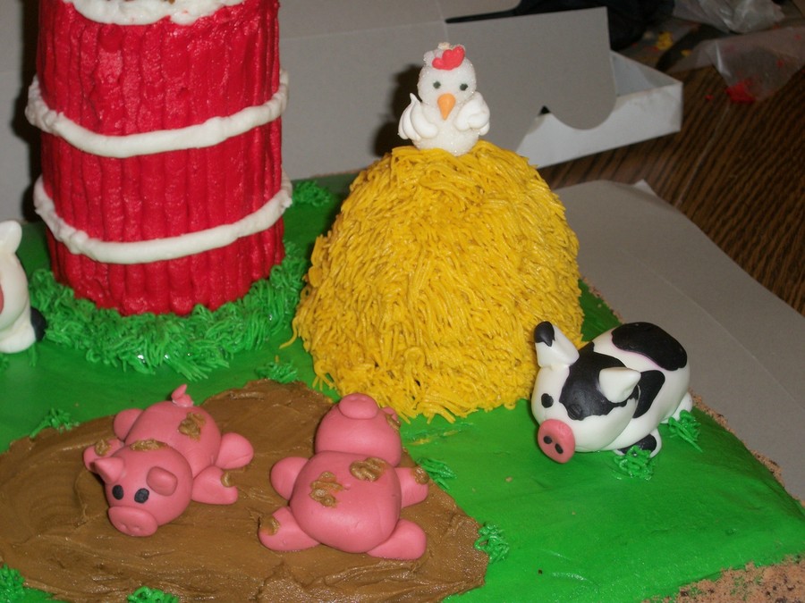 I made this cake for my cousins 1st birthday. This cake is completely edible. I made the animals out of fondant/gumpaste. The barn is a bunt cake cut in half and stacked on top of eachother. The hay stack is a mini wonder mold pan, and the silo is RKT. I had so much fun making this and everyone was so thrilled with how it turned out!
