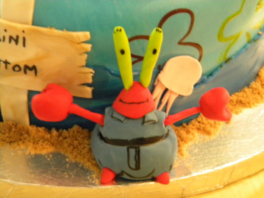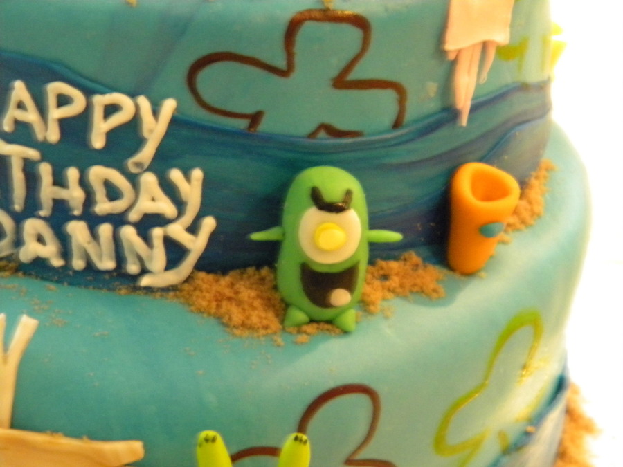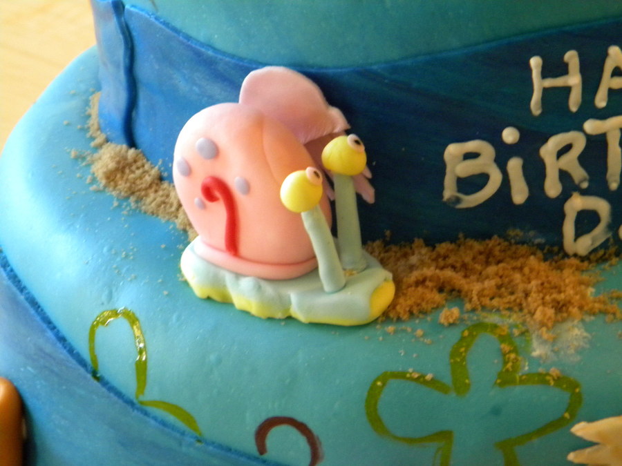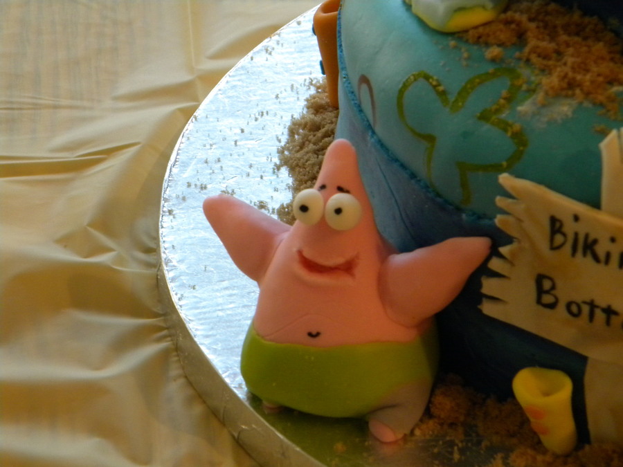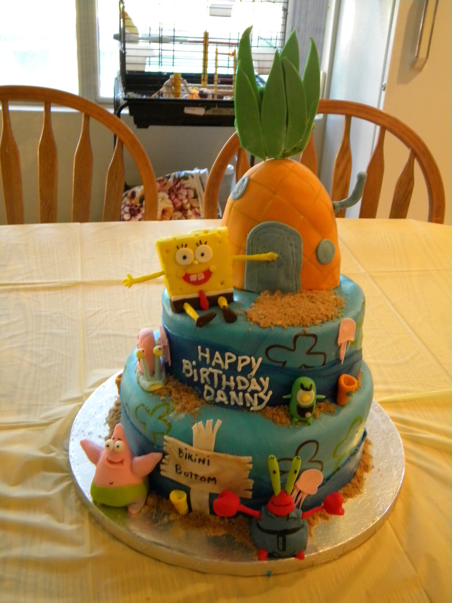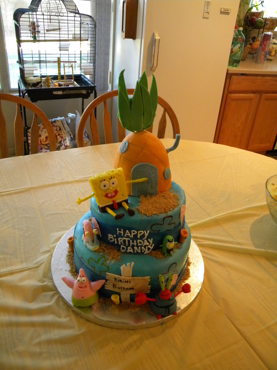 Spongebob and friends in Bikini Bottom, I made this cake for my son he loves Spongebob! all figures made out of fondant, spongebob house made of RC and covered with fondant.