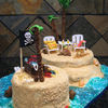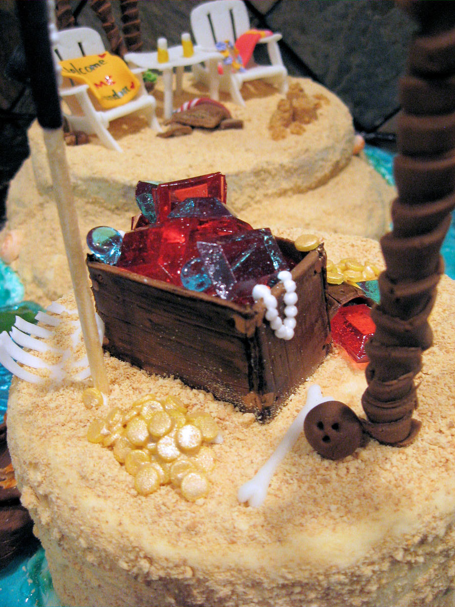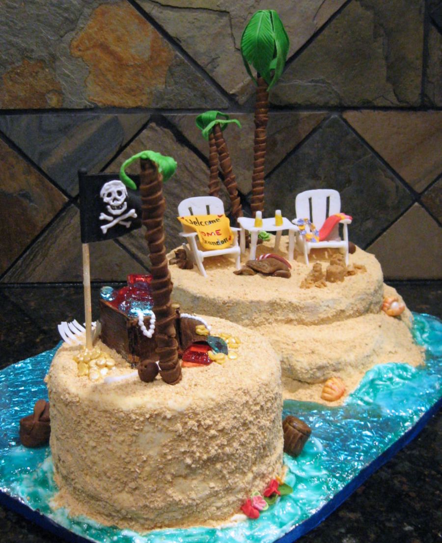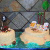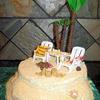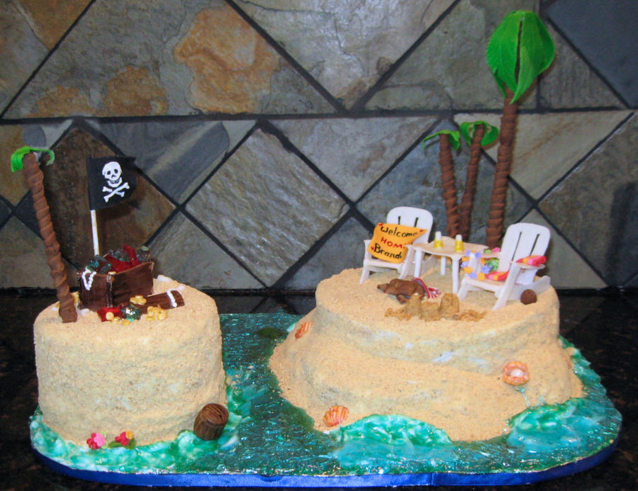 This is a cake I made for a friend. Her husband was returning home from an Army deployment and she also loves pirate stuff....had to make a cake that pleased them both. :) His cake is suppose to be like the Corona commercial with the chairs on the beach and the table with the beer. Everything on the cake is hand made.
