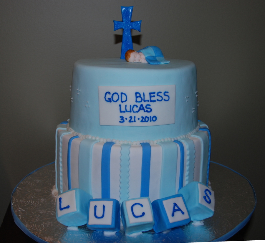 My first baptism cake!! 8" WASC with lemon mousse filling and vanilla SMBC and 10" Chocolate WASC with chocolate SMBC filling and covered in chocolage ganache. All covered in fondant with fondant accents. It took much longer than I expected but i'm happy with the results. Thanks for looking.