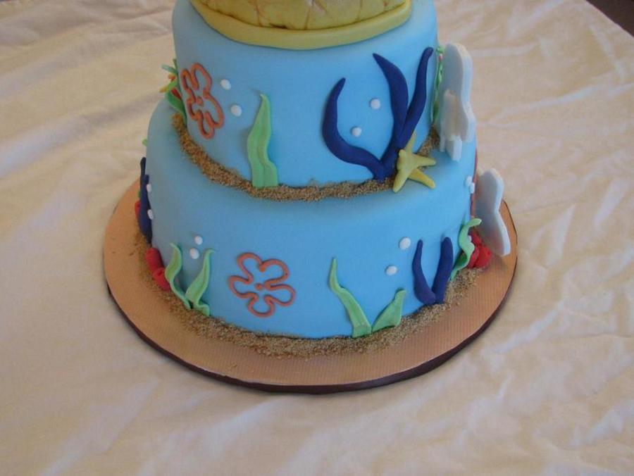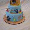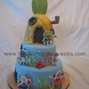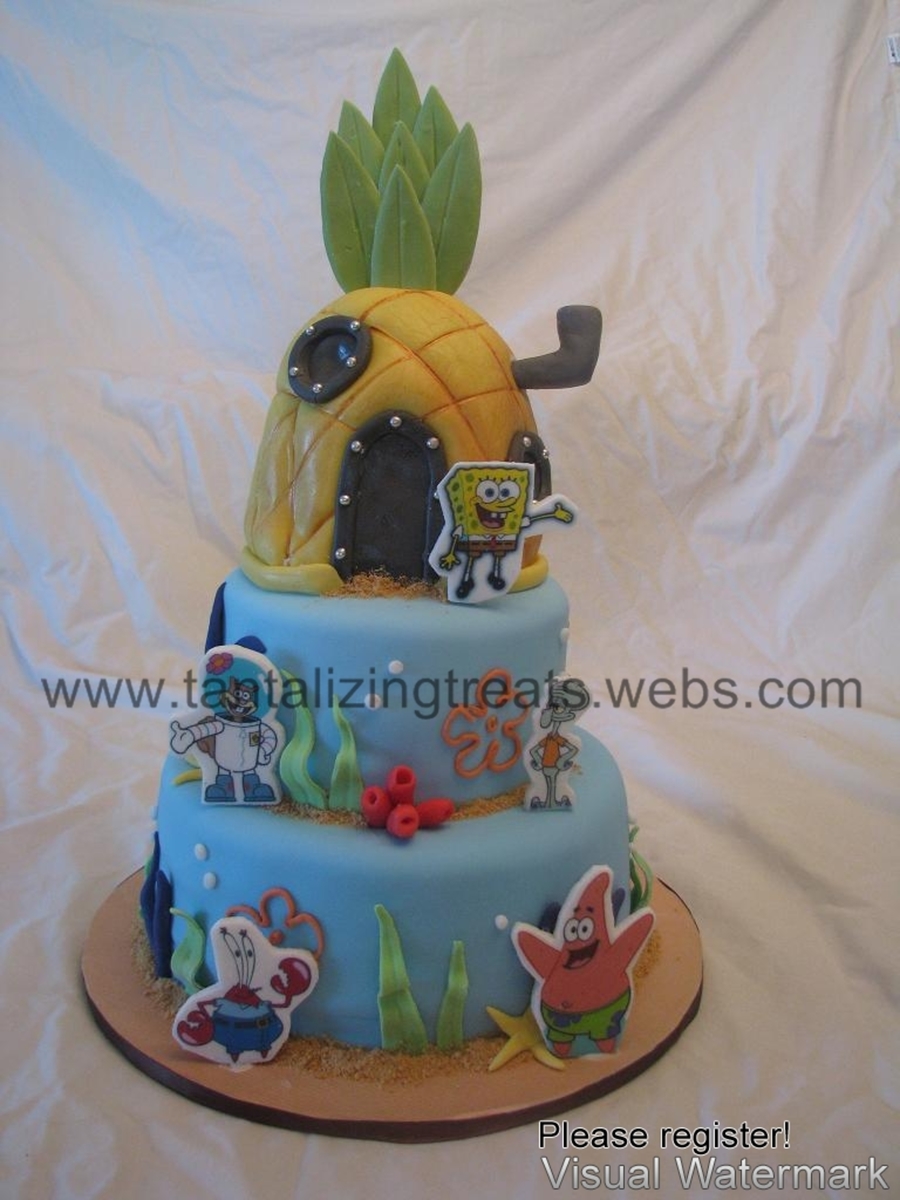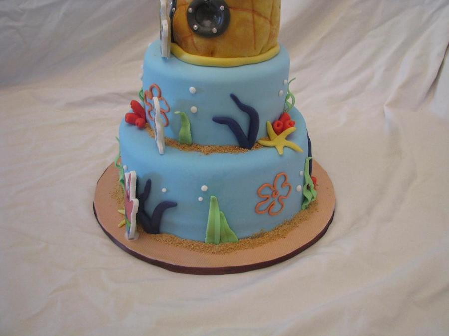 Spongebob cake.. all fondant.. spongebob's house is made from rice cereal treats covered in fondant. Edible image plaques for the characters.