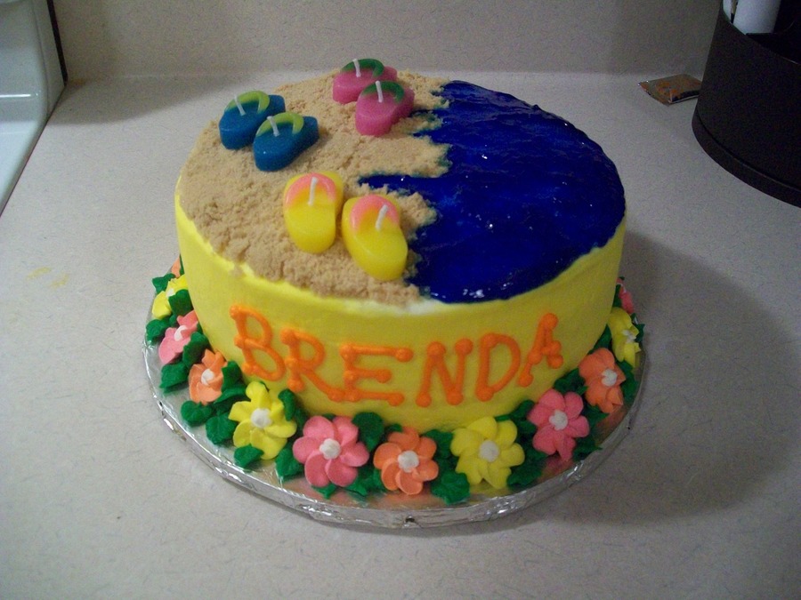 This cake was done for a beach lover's birthday! Royal Icing Swirl drop flowers, blue tinted piping gel for the water, brown sugar sand, and buttercream!