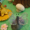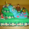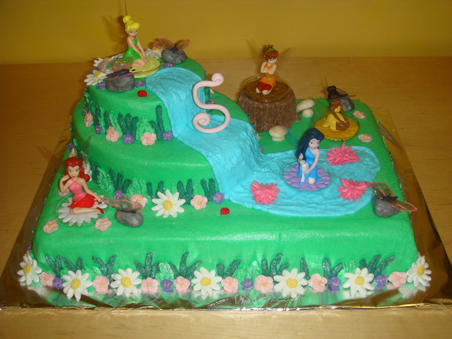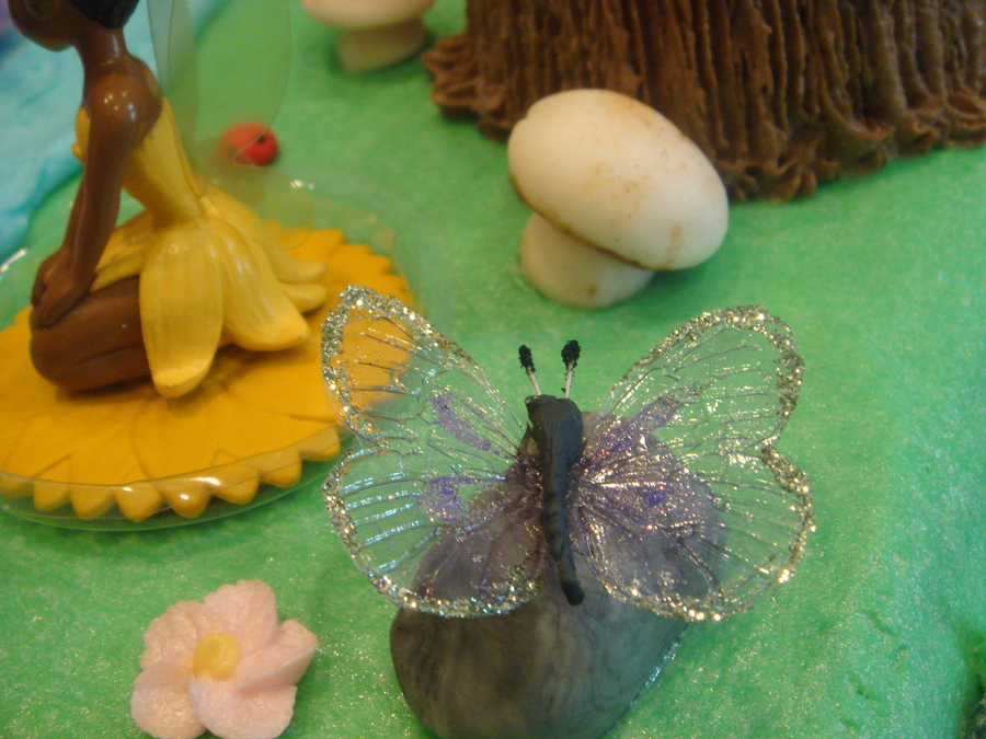Chocolate cake with buttercream icing; marshmallow fondant rocks and ladybugs; gumpaste "5", and gelatin butterflies
