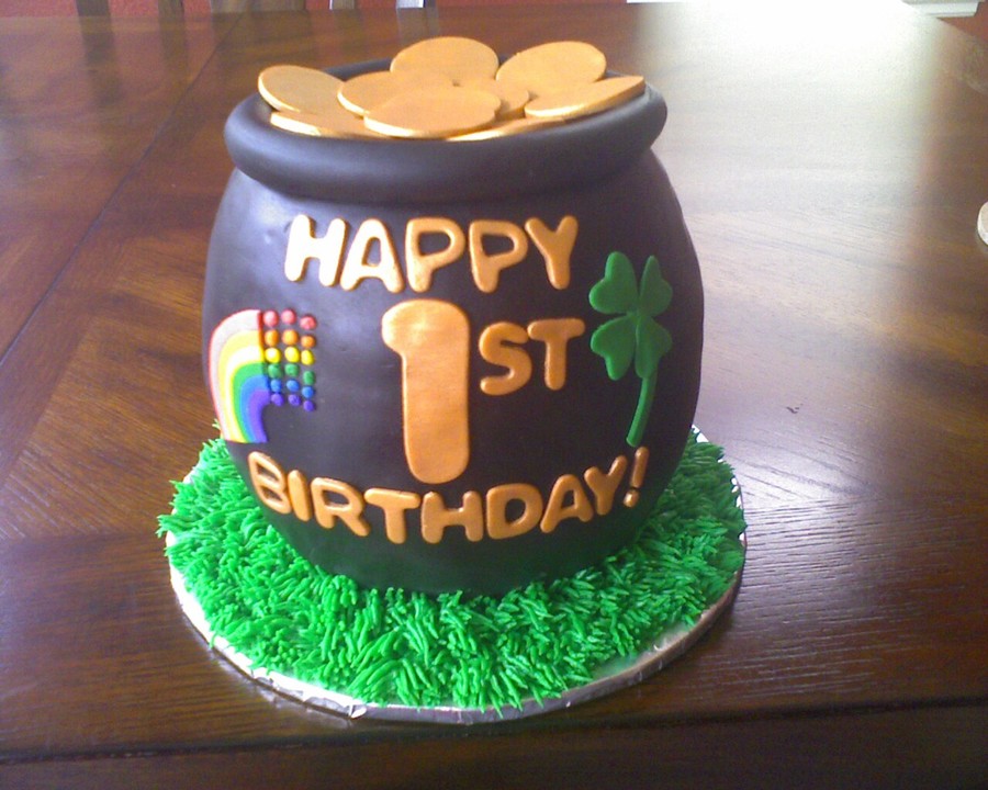 Pot of gold cake topper for a St. Patrick's Day birthday. Made from rice krispie treats and covered in fondant. Coins and letters painted with "old gold" luster dust.