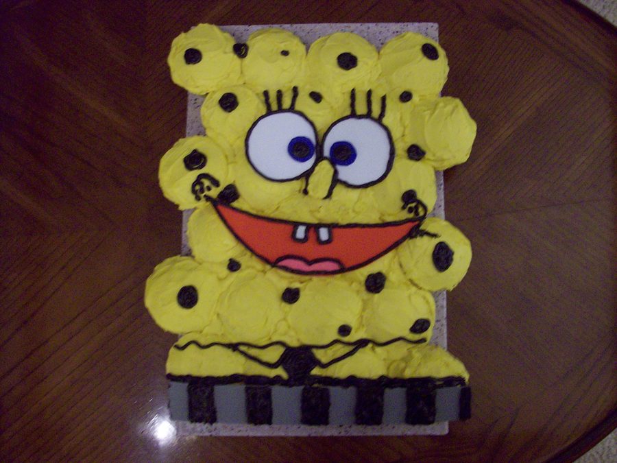 Spongebob it is! This is like a jigsaw puzzle made of 24 cupcakes. the face is made of fun foam and the dots are black chocolate buttercream.