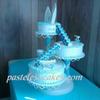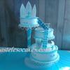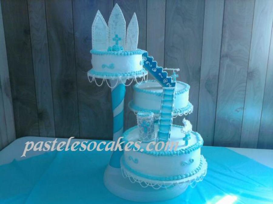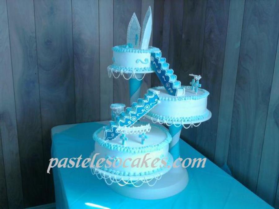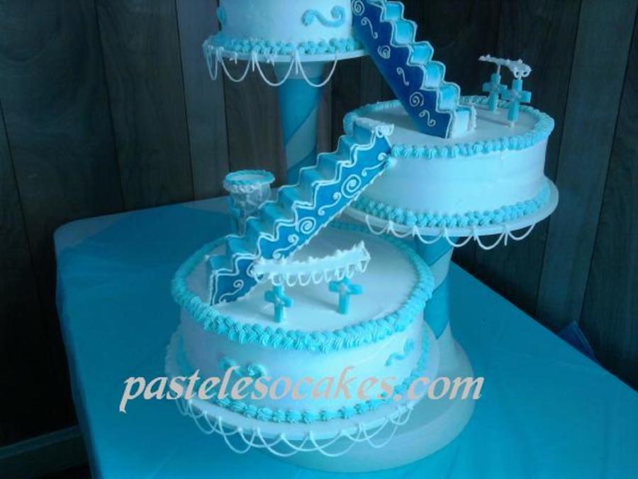 3 leches w/peach&pineapple filling,whipped cream frosted, the stairs are chocolate and gumpaste,panels r gumpaste and other decorations as well, with some RI string work,design picked by customer!!