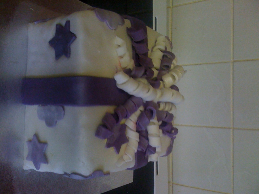 my first square covered fondant cake, not entirely happy with it, but still enjoyed it. white sponge with strawberry sauce buttercream, all fondant, some marble effect fondent accents and curliques and sprayed with silver pearl lustre, tfl x