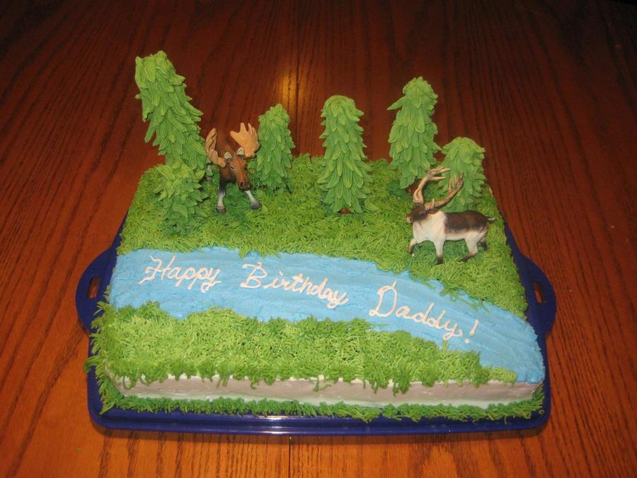 I made this cake for my husband for his birthday. He is a hunter, so I made a little forest scene for him with royal icing trees and a moose & an elk (well, it was a reindeer with elk horns lol) I did not make the animals, this was among the first cakes I made, so I was in no way capible of making an animal at that point lol. :) But my hubby loved it. That's all that matters.