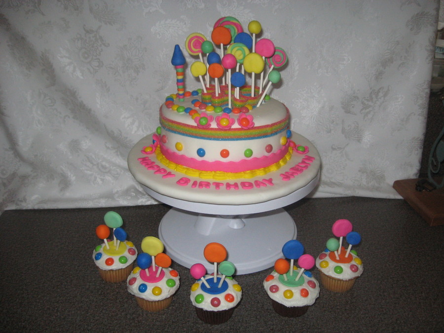 I did this cake for a customer who was doing a candyland them. My sister helped me on this one and we had so much fun with it. We also made cupcakes to match. It was so colorful I really loved it.