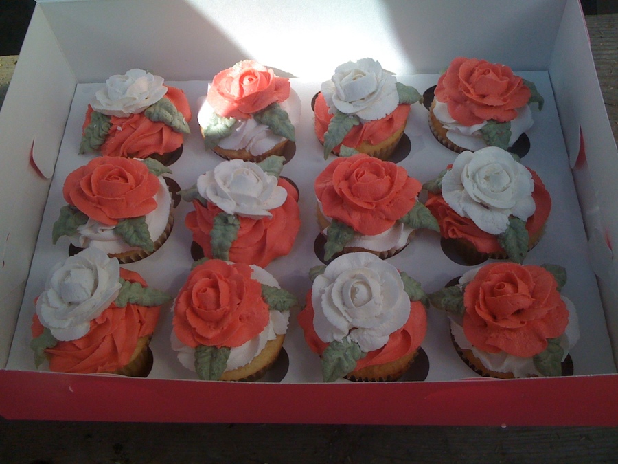 Vanilla cupcakes with vanilla buttercream, and buttercream roses.