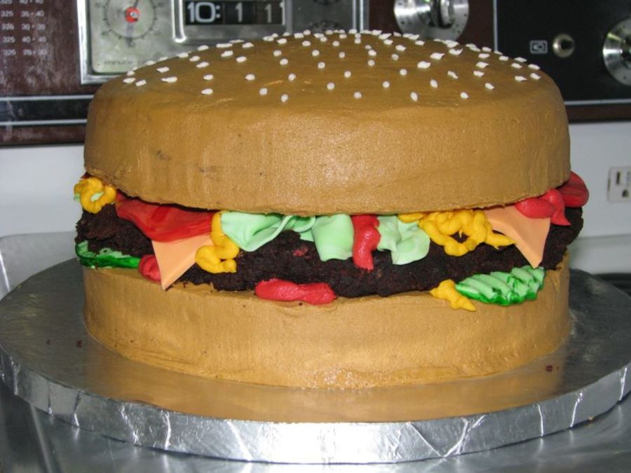 this was my second attempt at a cheese burger cake. It is covered in buttercream with fondant pickles, tomatoes, lettuce and cheese.