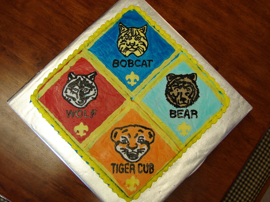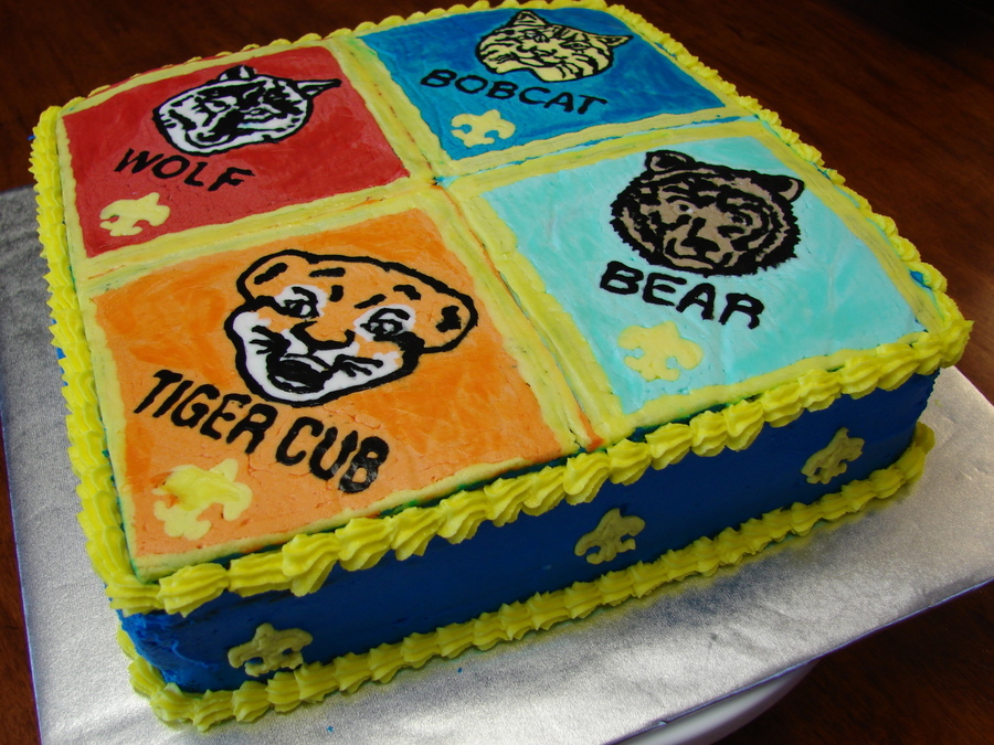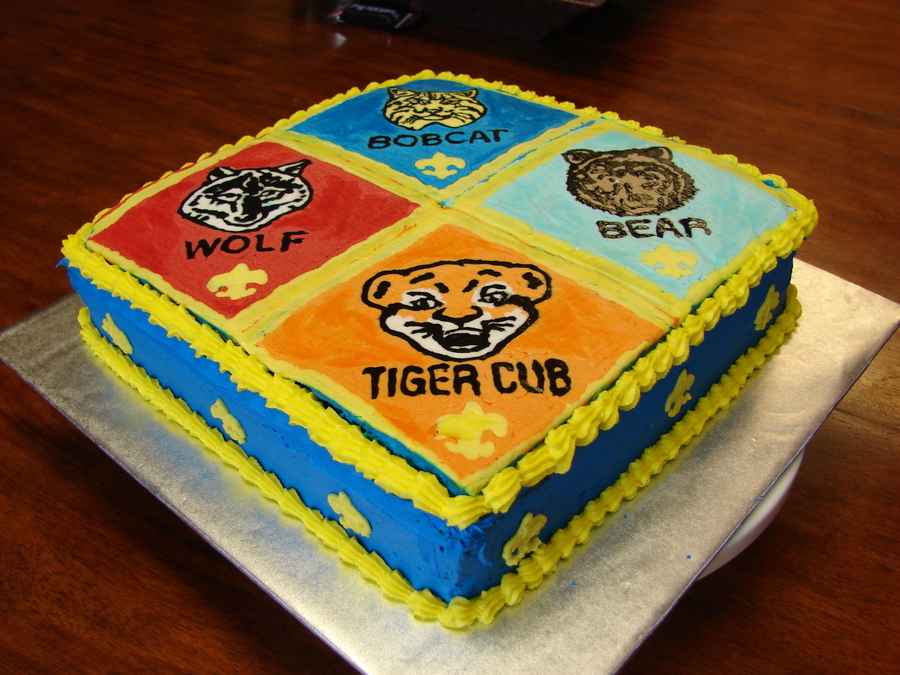I made this cake for a Cub Scout cake auction. 10 inch square pan, all buttercream. Badges and fleur de lis made using FBCT. This was my 1st time using this method. Love it!! I was very happy with how the detail on the animals came out.