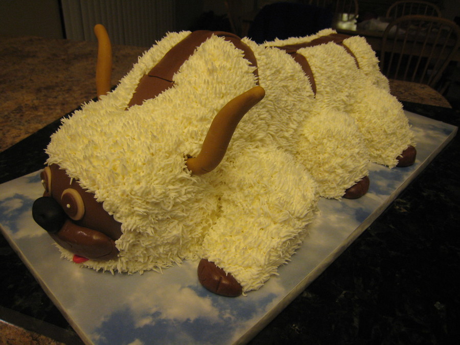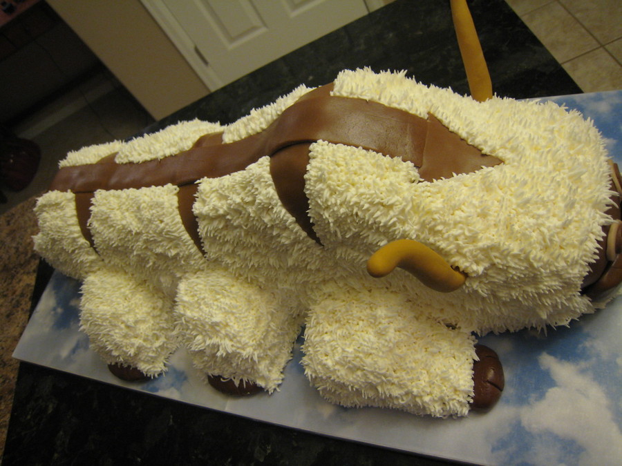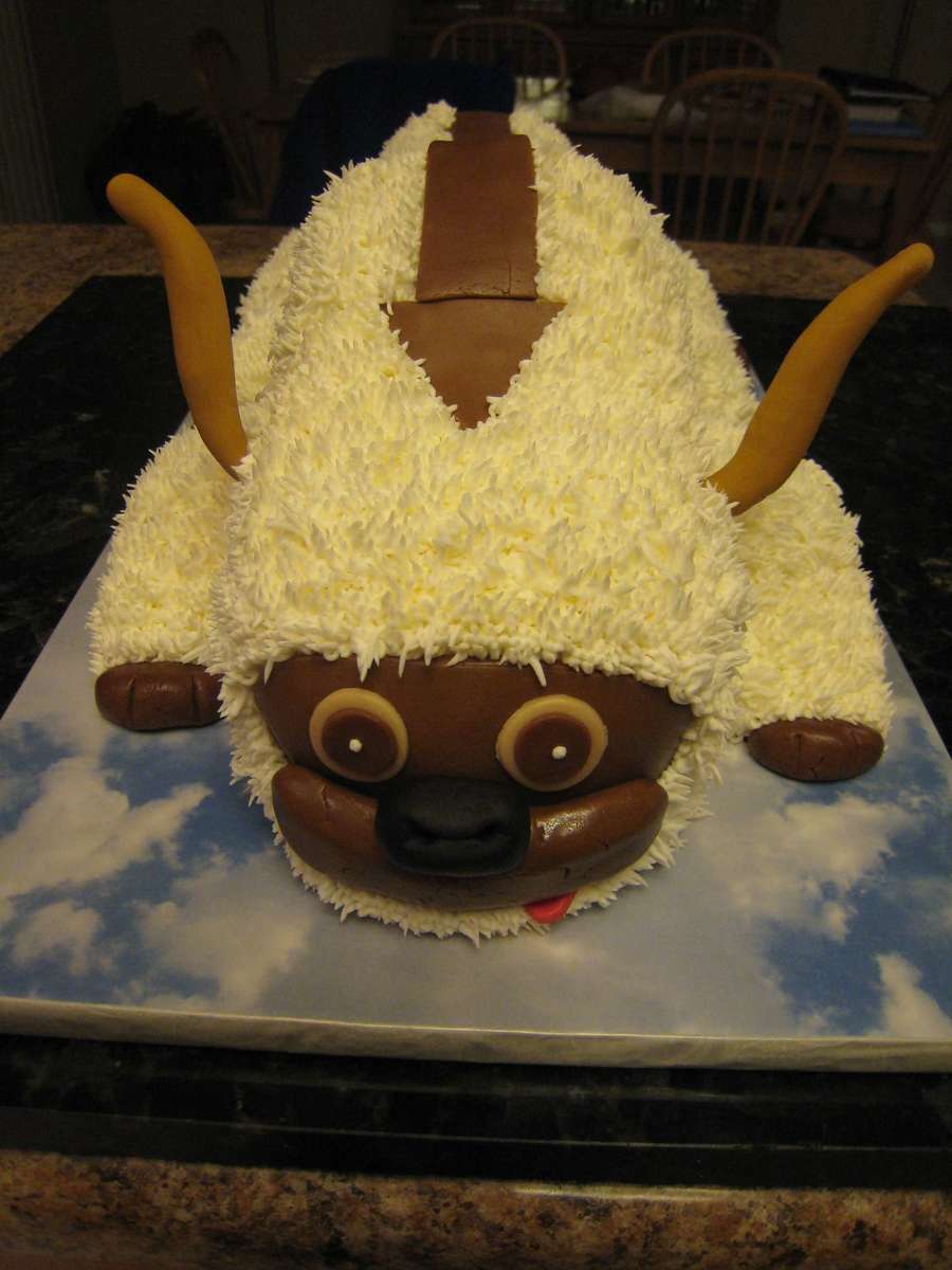 Sour Cream chocolate with vanilla bavarian cream filling. Used 2 - 9 x 11, 2 half ball and 1 half round bread pan. Cut 9 x 11 lengthwise for body, topped with half round bread pan. Used ball pans for face and hump. Used xtra 9 x 11 for legs and to fill in under hump and face. Fondant face, hoofs; gumpaste horns.