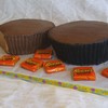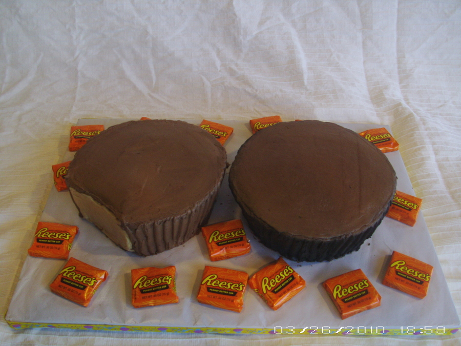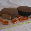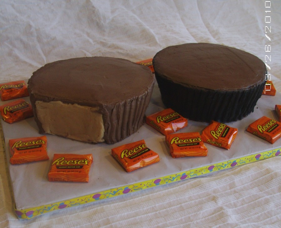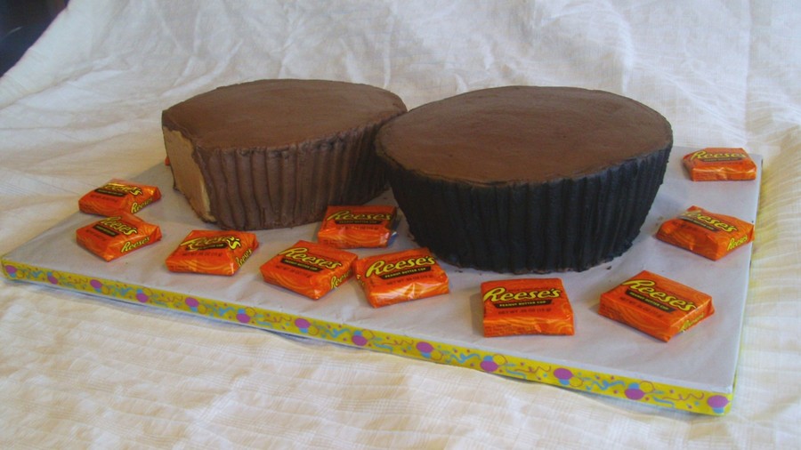 Thank you to all on here with the great Reese's cakes I was able to look at for inspiration. These are 10" cakes carved away and covered in chocolate buttercream. The "wrapper" was just done with black coloring and my airbrush. I combed the sides with one of those Wilton triangle comb things for the ridges. TFL!