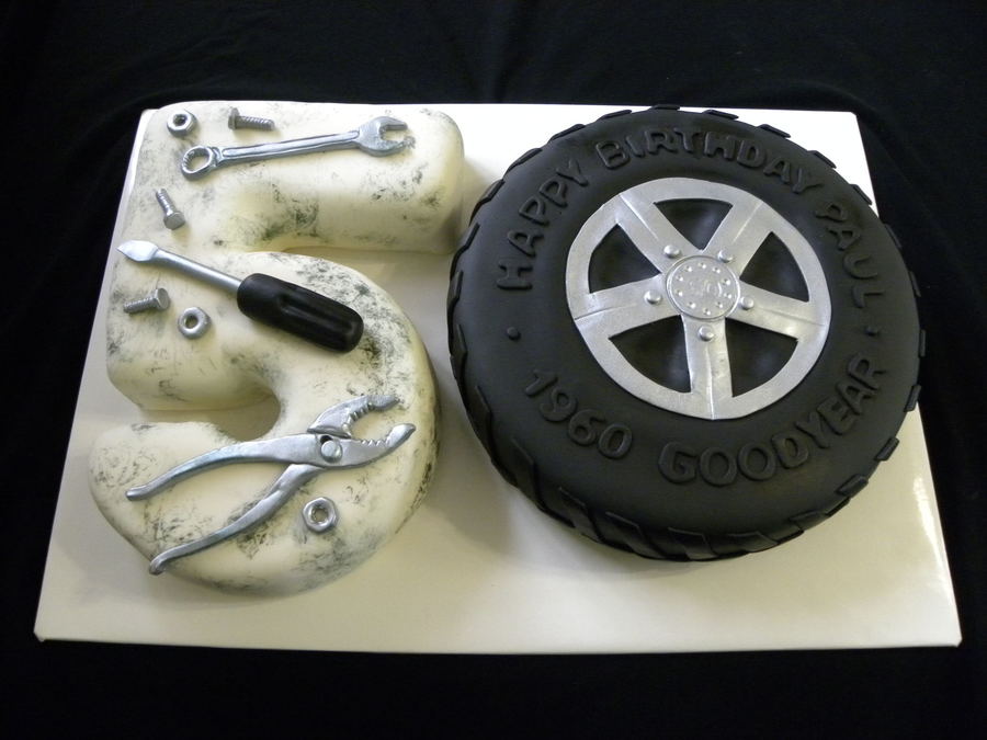 For a mechanic's 50th birthday. 5 is carved from a 7" round and a 6" square, using nefgaby's number cutting chart. ( here's the link) http://www.cakecentral.com/cake-photo_1111573.html . Thank you to nefgaby for sharing. I'm sure I'll be using it again in the future. The tire is a 10" round. Carrot cake with cream cheese filling. All fondant. Gumpaste and fondant accents airbrushed with silver. Thanks for looking!!