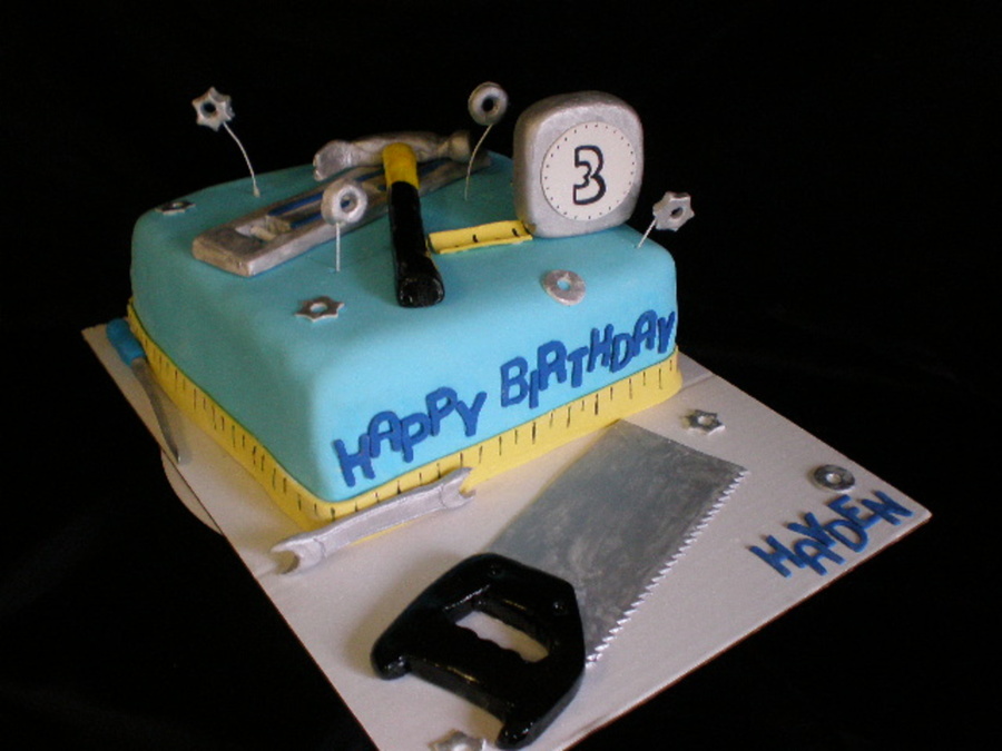 made for boy who loves tools! half white, half chocolate cakes, iced with buttercream and covered in fondant. tools made from fondant.