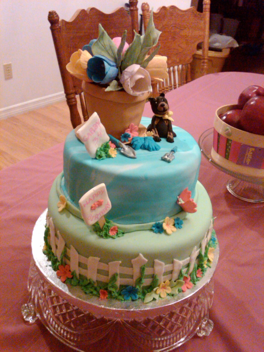 I was asked to a cake with garden theme and a rottweiler. flowers are made of gum paste and everything else is fondant and chocolate cake