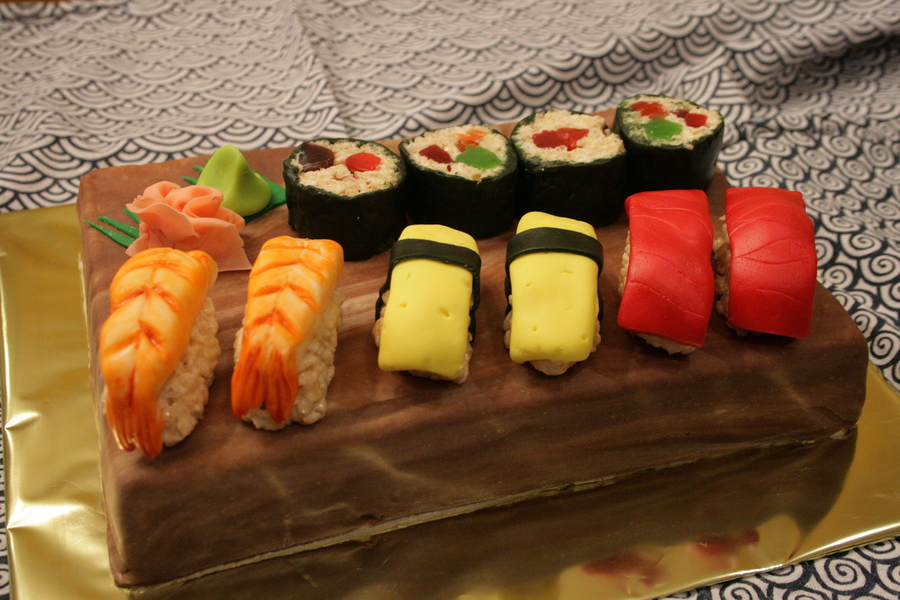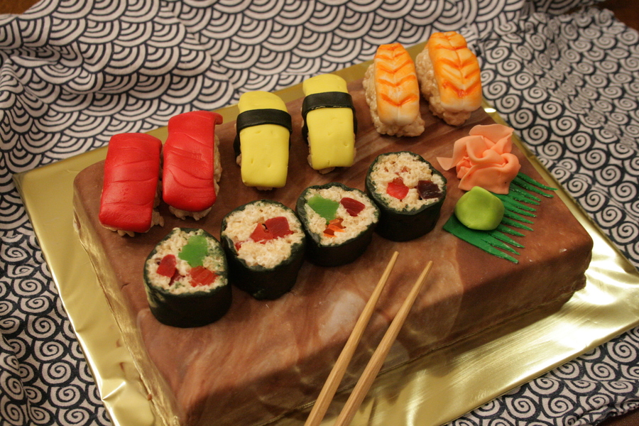 My daughter & I whipped this up without much planning, for her friend's birthday. It was a lot of fun to make and think it turned out decent. Chocolate cake with butter cream frosting and all fondant decorations with RKT. (The chopsticks are real)
