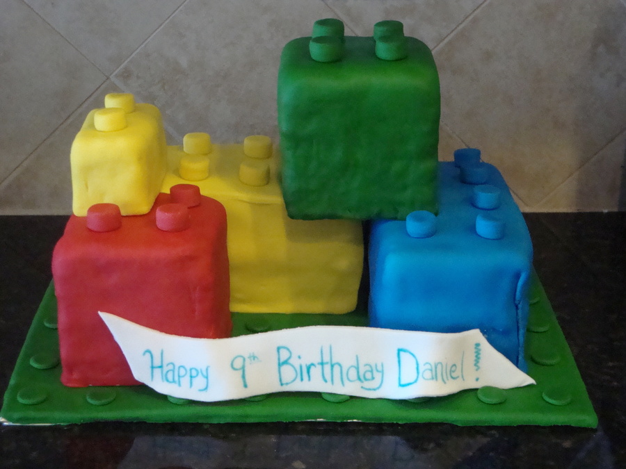 lego cake blocks. made the cake blocks from halving 8' square pan, the rest is covered RKT. This was a good learning experience...I learned my 8" pan doesn't bake to a true 8'!!! LOL. So off to buy new 8" pans!