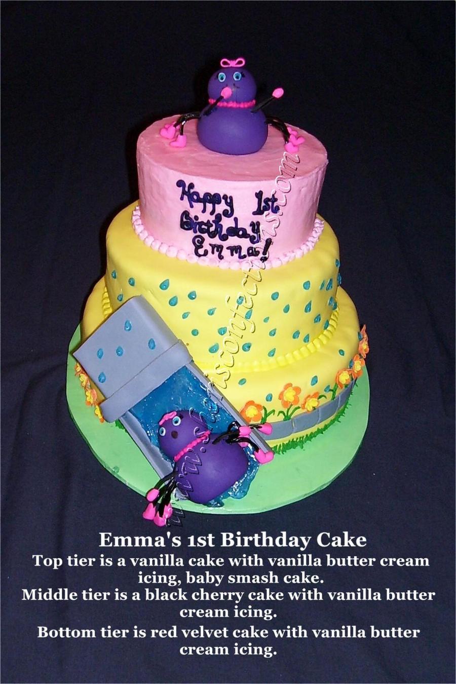Top tier is butter cream iced and to be removed for baby smash cake, middle and bottom tiers are covered with fondant. Rain drops and water in down spout is poured sugar, all decorations are fondant and spiders legs are black licorice.