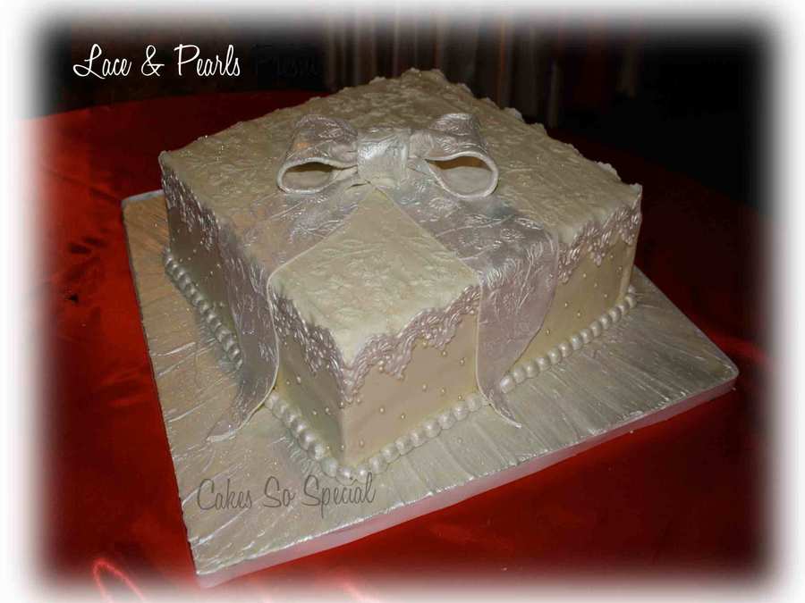 12" square cake with Rosa Ortega laces and pearls with a bow. Top was impressed with a rolling pin. TFL