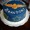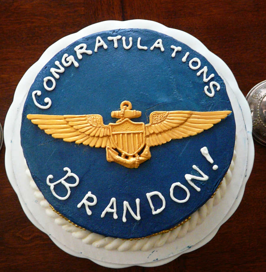 My husband got his Naval aviator wings, and so I made him a cake because it's what I do. It's a chocolate cake with peanutbutter mousse filling covered with buttercream. The wings are sculpted from fondant and painted with gold luster dust.