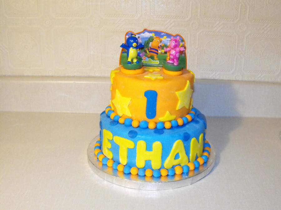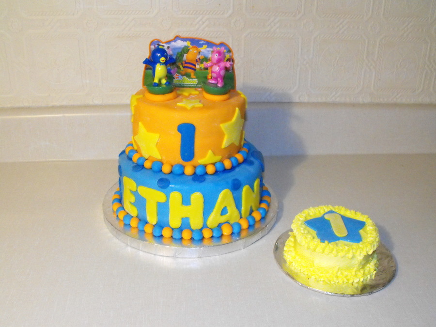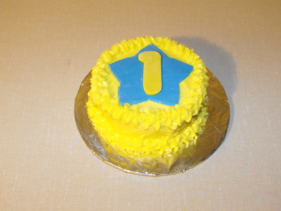 Made this for my newphew's 1st birthday...I had some issues with it, but thankfully I was able to cover it up with decorations and border. White cake with all fondant, smash cake is buttercream with fondant start and #1.