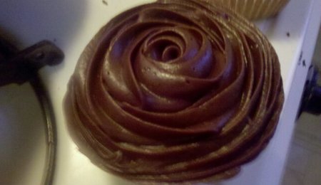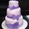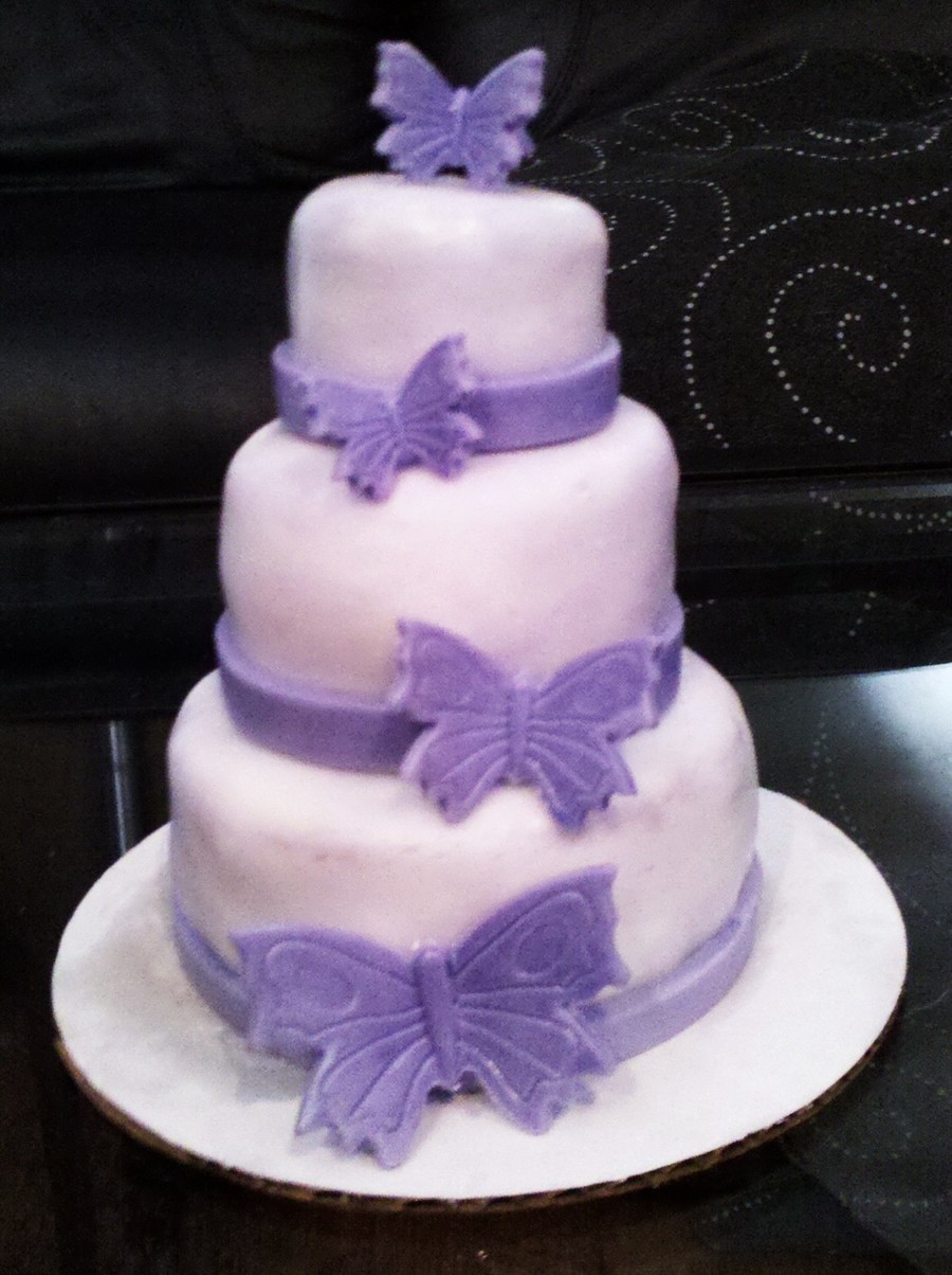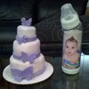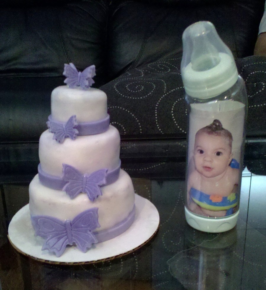 Its yellow cake with chocolate mousse and strawberries filling with buttercream as the crumb coat, covered in fondant and the purple decorations are fondant/gumpaste. The bottle is there to compare the size to something, its a 9oz playtex baby bottle. TYFL.