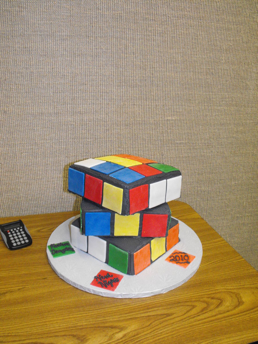 we had a daddy daughter nerd night at our church so i made this rubik's cube cake! butter cream icing and fondant squares. didn't realize until after that two of the centers are yellow and i'm told that's impossible....lol....live and learn i guess.