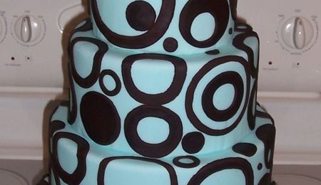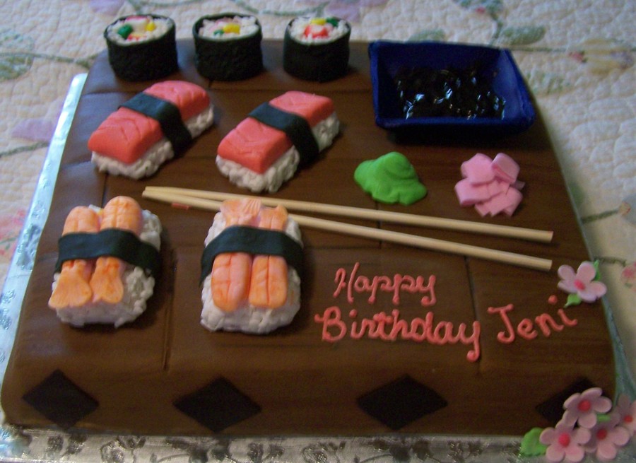 Rice Krispy covered fondant sushi. sitting on a 14" square cake covered with mixed brown fondant made to look like a serving board. Had to eat a lot of sushi to get the size and color down.