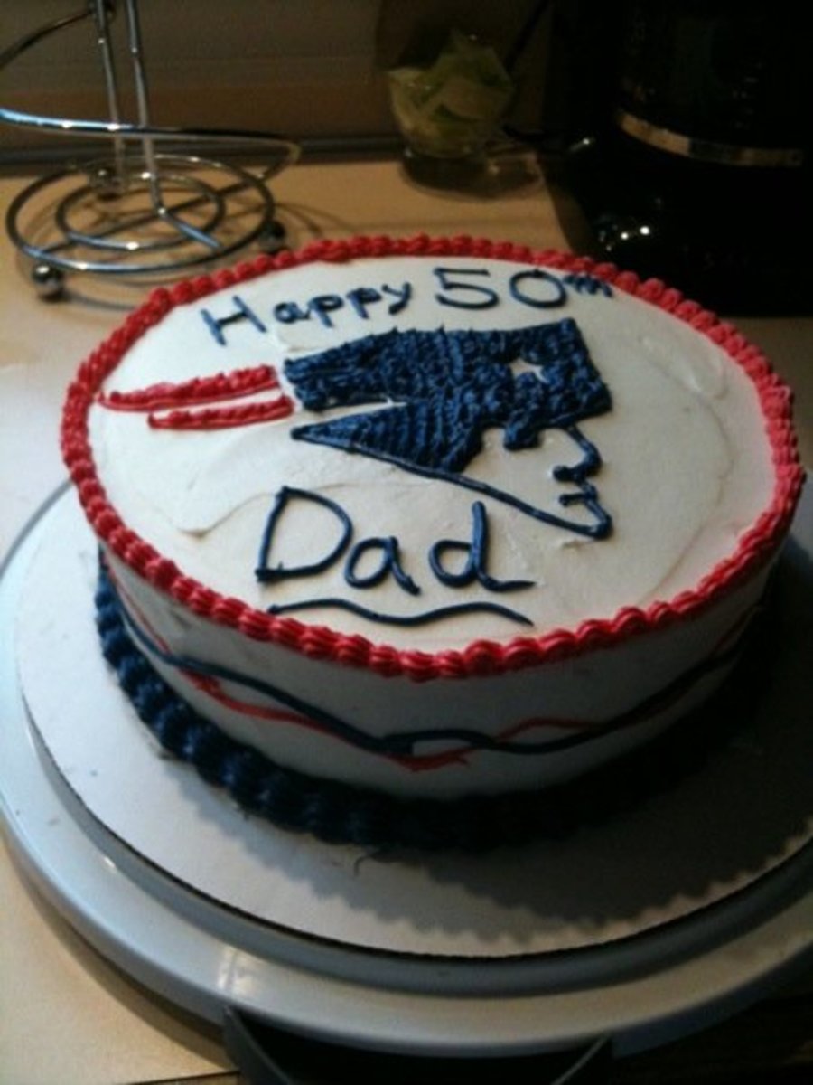 This was a birthday cake I made for my dad's 50th birthday, big fan of the New England Patriots. Its a "wacky" chocolate cake (his favorite) with cream cheese frosting, the patriots head was hand drawn