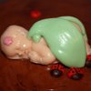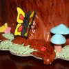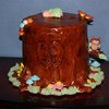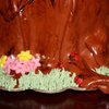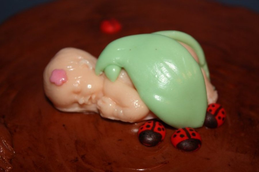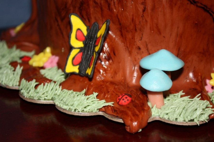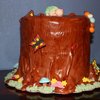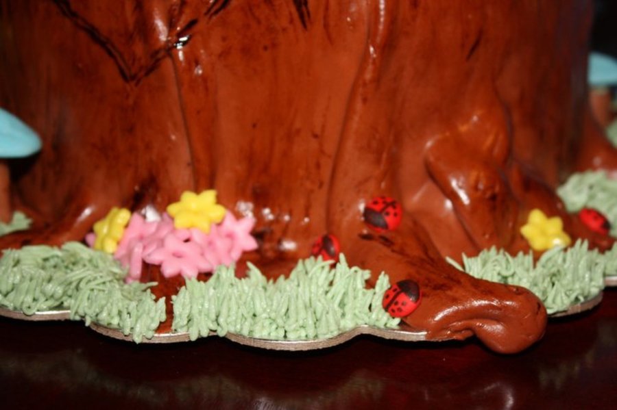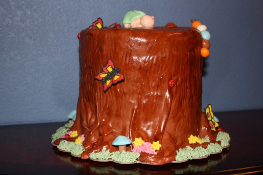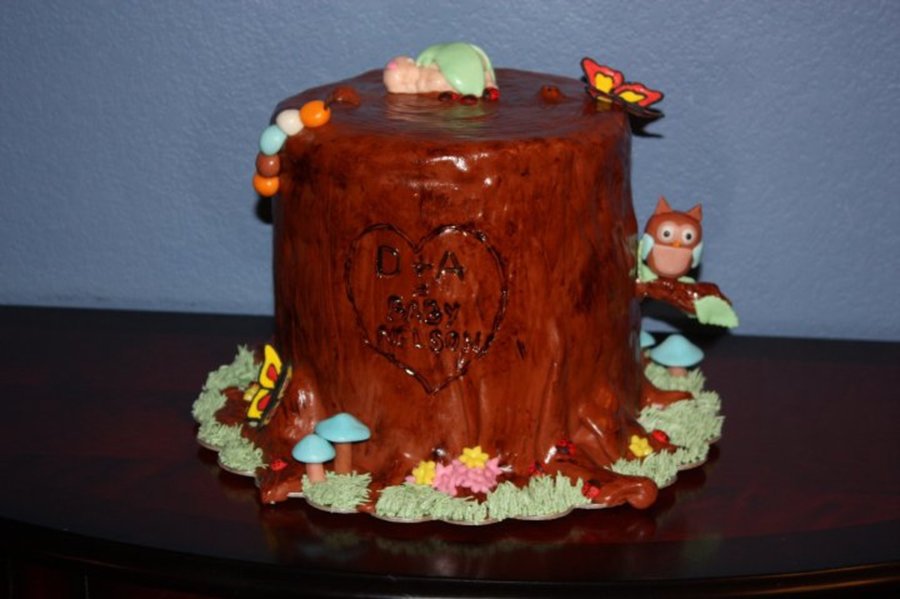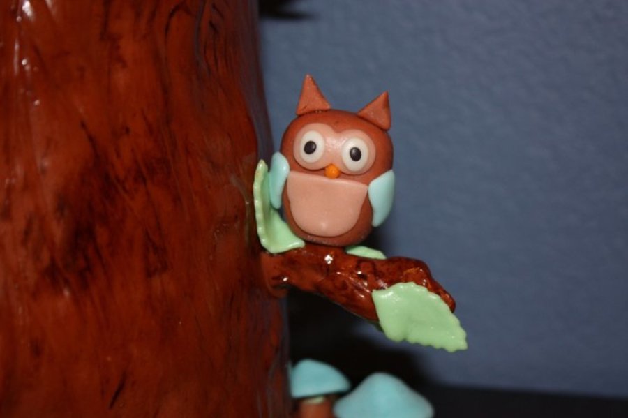8" x 8". Covered in fondant. Baby, owl and tree branch are gumpaste. Butterflies and ladybugs are royal icing. All the rest is fondant. Themed to match the baby's bedding and room decor.