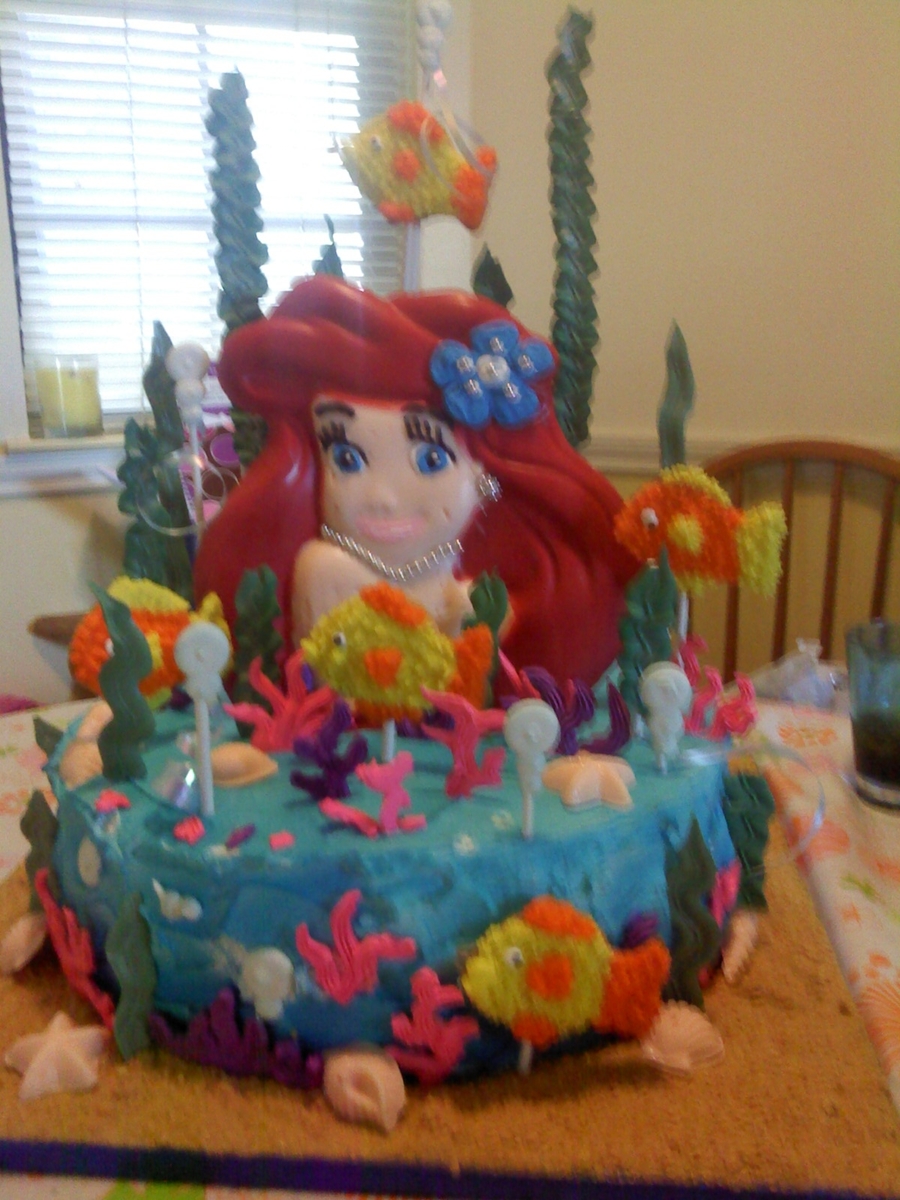 the ariel standing up on the cake is a candy plaque. the cake was 3 layers - caramel, white and chocolate. the sand is graham crackers, the seashells are candy, the fish are cookies and the seaweed, coral and airbubbles are royal icing. ea was most happy with her cake - she even helped put some of the coral on the cake.