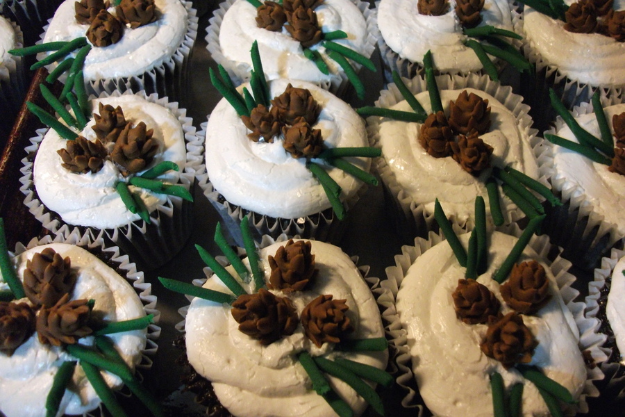 "hot" chocolate cake, marshmallow filling and vanilla frosting. pine cone decorations from fondant.