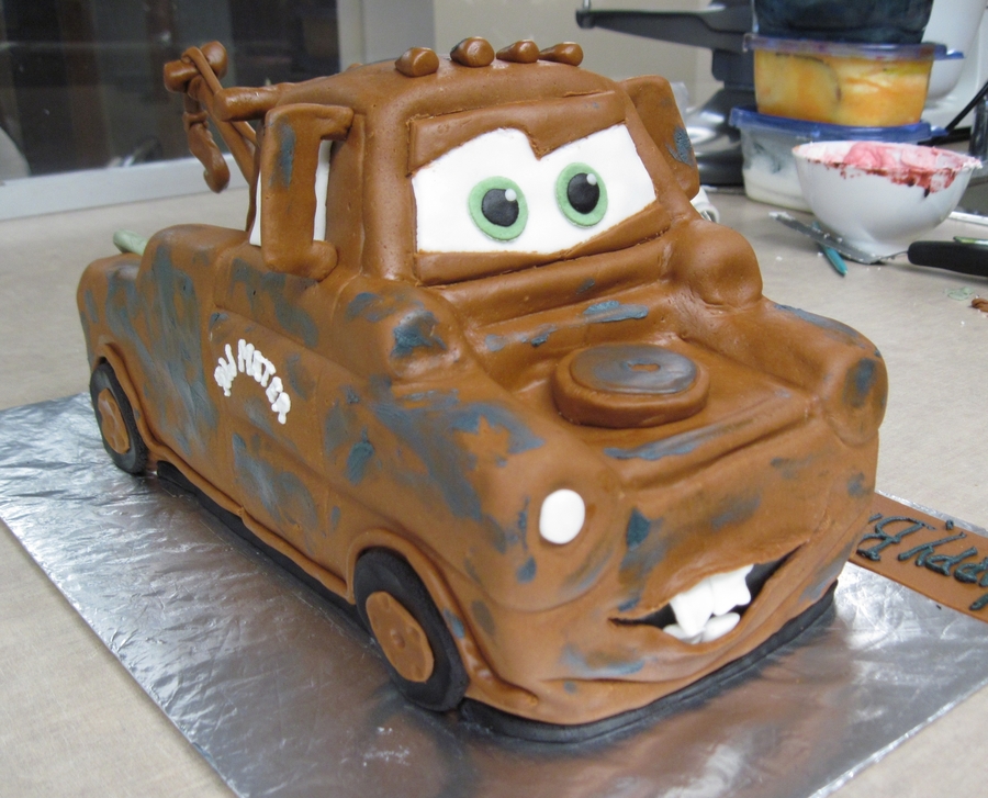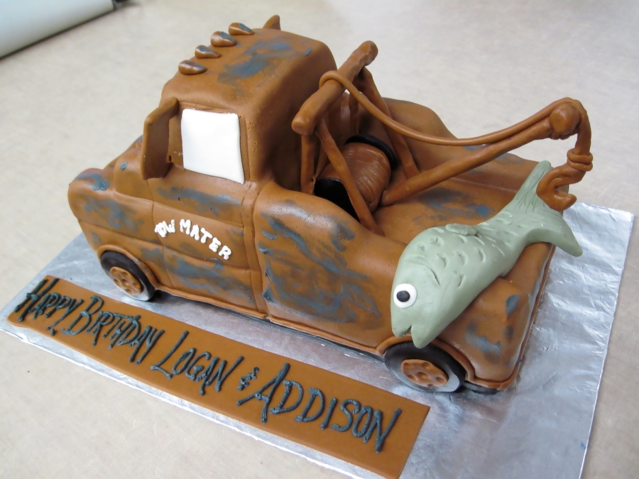 This is my first Mater cake, and I think it turned out quite well! It was for a brother and sister. He likes Mater, she likes fish. Lol. It was a white cake, covered and decorated with fondant.