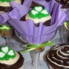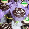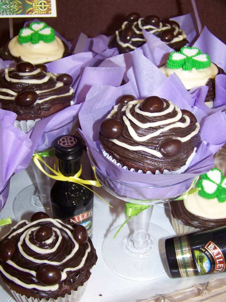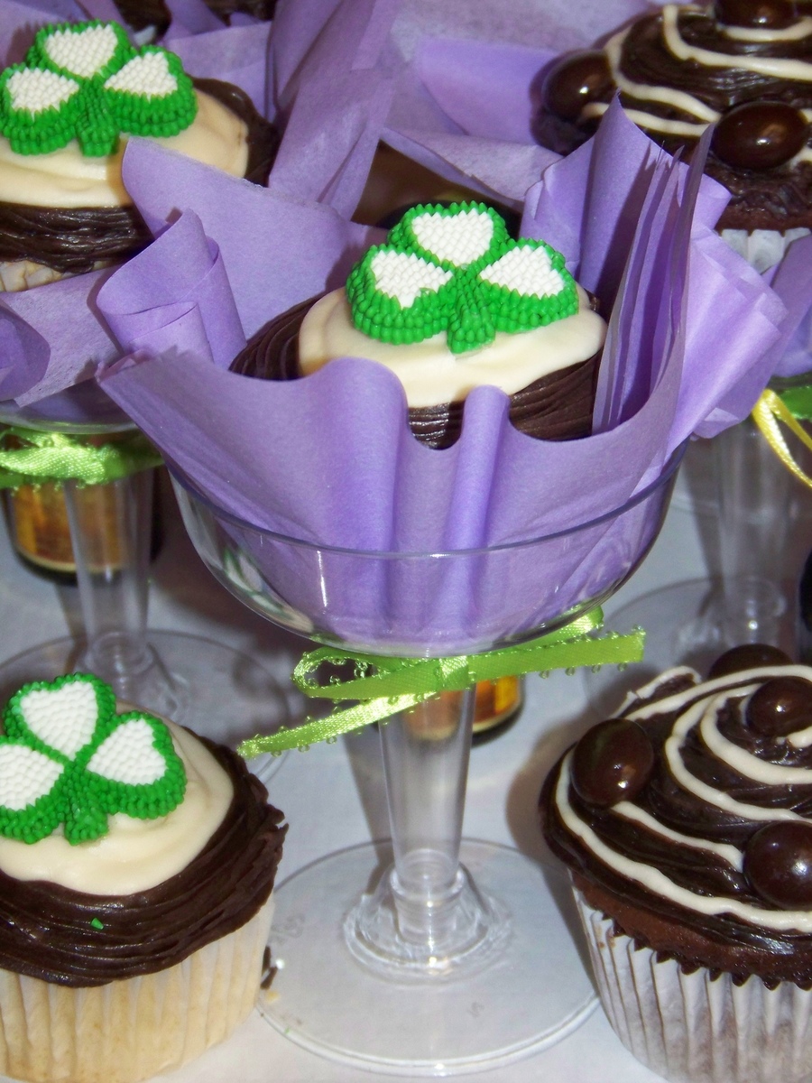 2 cupcakes on this party platter. Irish Cream cupcakes with irish cream pastry cream, irish cream frosting and fudge frosting, topped with shammrock. Mocha cupcakes with ganache filling and fudge frosting