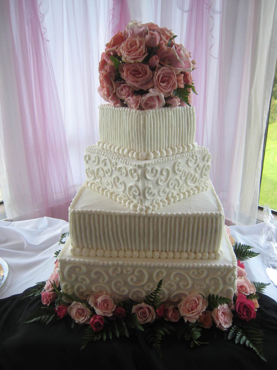 all buttercream frosting. different flavors of cake on each tier. i love the effect when you turn the top two layers-it was so much more appealing than a regular square cake.