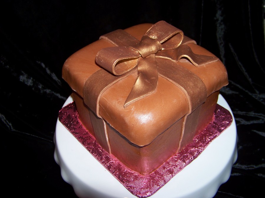 this was for my sons co-worker. He ordered it just because. (nice guy) Chocolate cake with chocolate filling and fondant ribbon and for the lid we just covered the cake with a piece of fondant.